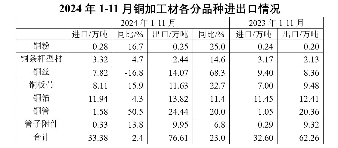 2024年1-11月,我国铜加工材进口33.38万吨,同比增长2.4%,出口76.61万吨,同比增长23.0%,实现净出口43.23万吨,同比大幅增长45.8%,再创历史新高,连续六年实现净出口。从细分领域看,铜丝进口7.82万吨,同比下降16.8%,出口14.07万吨,同比增长68.3%,净出口6.25万吨,铜丝今年将首次实现净出口;铜板带、铜箔(含覆铜板)净出口量分别达到3.52万吨、1.88万吨,同比增长41.9%、95.8%,净出口量继续扩大。分品种中,目前只有铜条杆型材、铜粉还未实现净出口,但净进口量也继续减小。