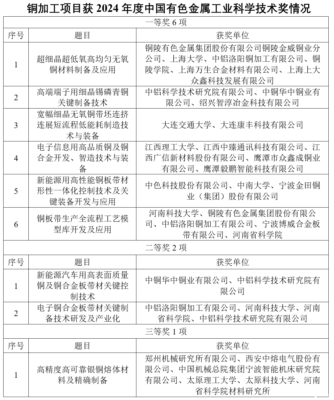 9项铜加工行业项目获2024年度中国有色金属工业科学技术奖。其中一等奖6项,二等奖2项,三等奖1项。