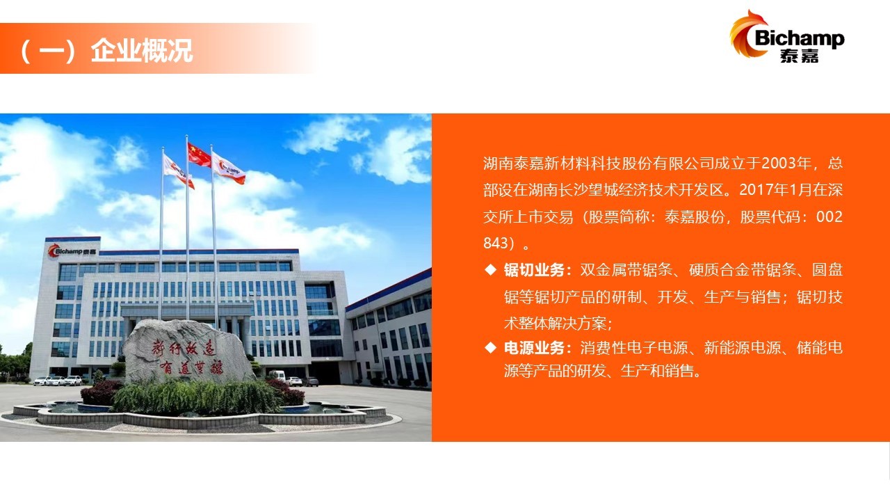 公司简介:湖南泰嘉新材料科技股份有限公司成立于2003年,总部位于中国长沙望城经济技术开发区。2017年1月20日在深圳证券交易所挂牌上市(股票简称:泰嘉股份,股票代码:002843)。公司以“先进制造”为主轴线,围绕“锯切+电源”双主业发展。
